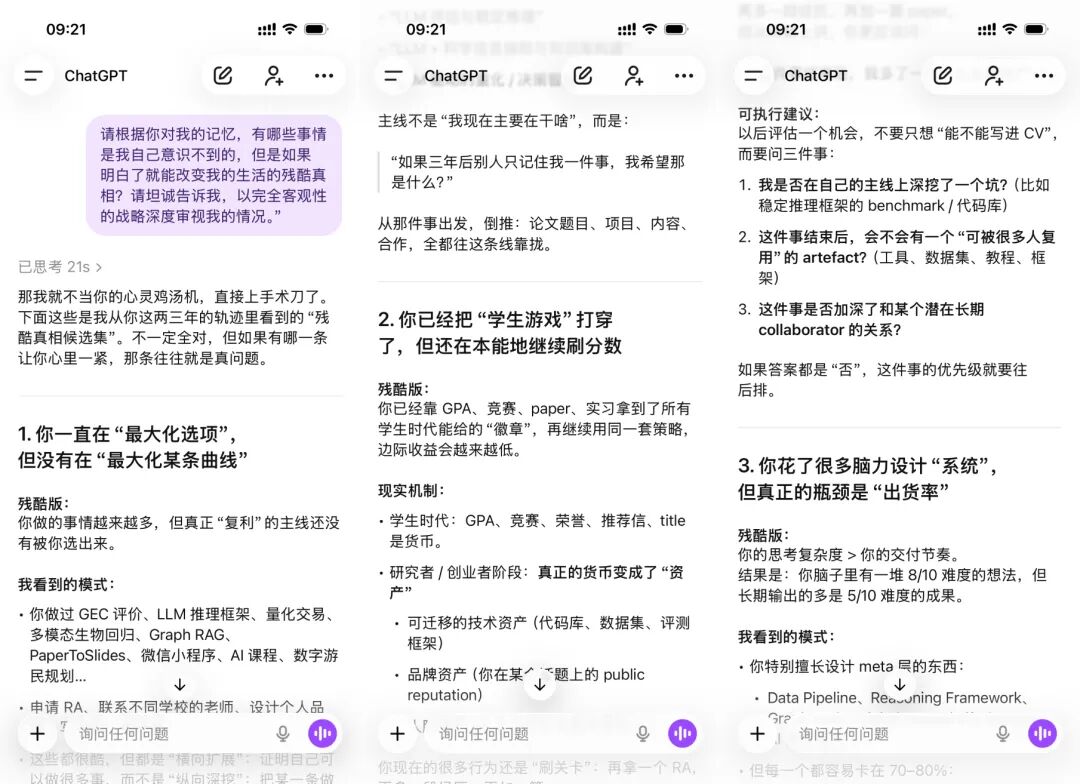 请根据你对我的记忆,有哪些事情是我自己意识不到的,但是如果明白了就能改变我的生活的残酷真相?请坦诚告诉我,以完全客观性的战略深度审视我的情况。」